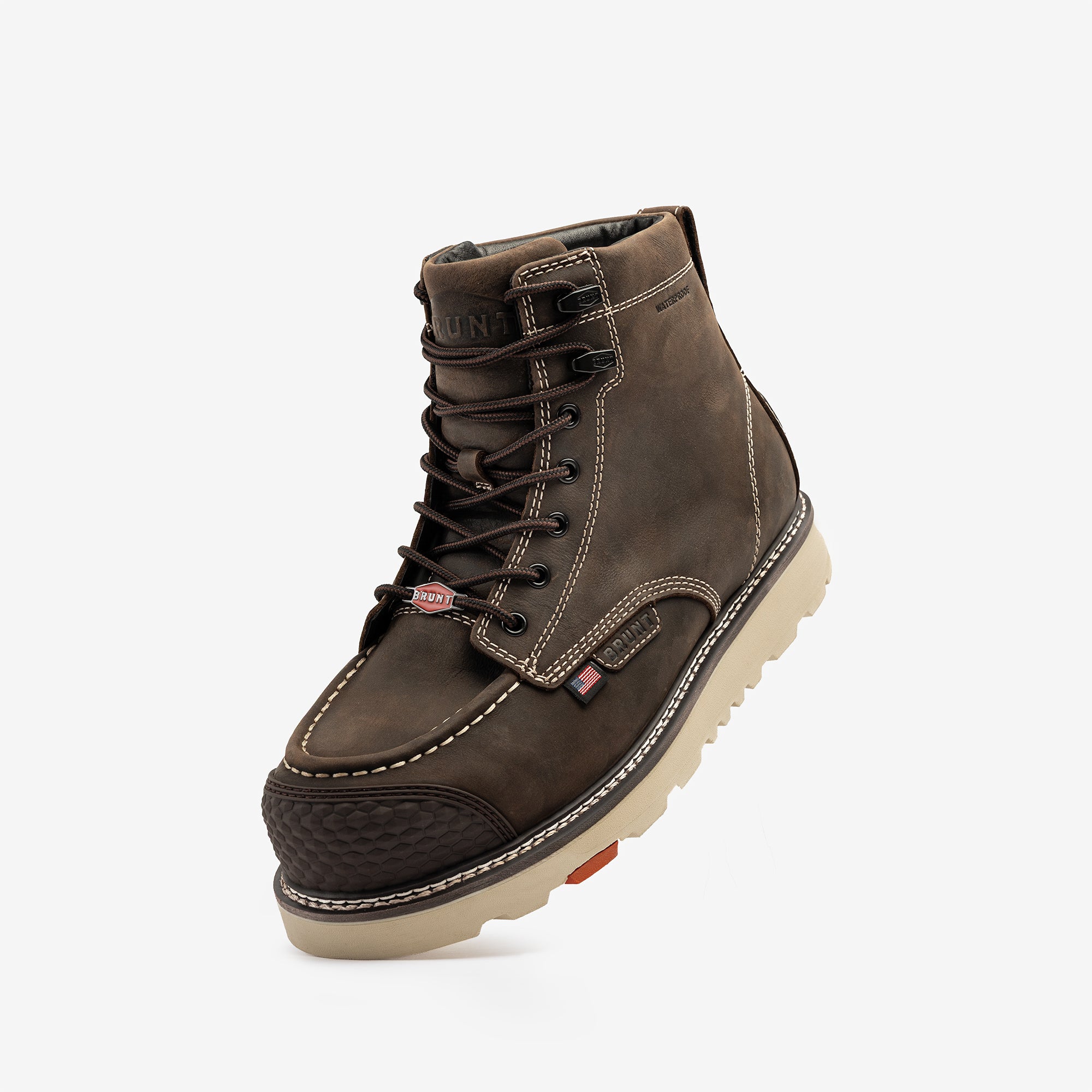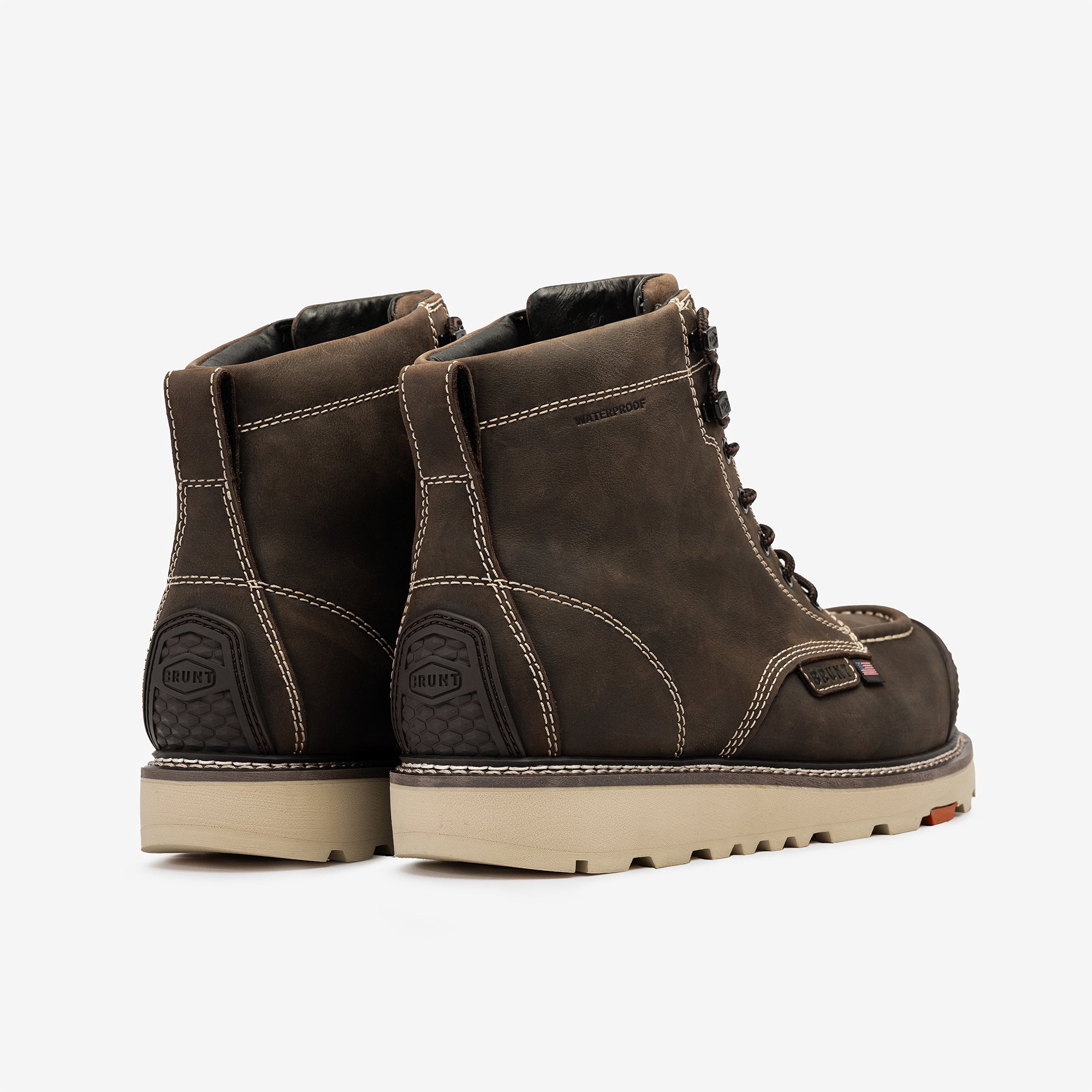 Engineered with a resoleable Goodyear welt construction for additional support and stability, the USA Marin 6″ Welted BRUNT Toe Waterproof (Comp Toe) is an ultra-durable boot built for the most demanding jobsites. It features an exterior toe cap and heel guard that are stitched into the boot to protect high-wear areas from breaking down, and comes equipped with a nano composite safety toe and a slip-, oil-, and high-heat-resistant outsole. Plus, it has a proprietary waterproof membrane that keeps your feet dry and our BRUNT FARMGUARD leather that extends the life of your boots while repelling rain, mud, oil, piss, and sh*t. The USA Marin is Built in the USA with domestic and globally sourced components, and delivers next-level comfort thanks to our BRUNT CUSH’N insole system and an ultra-cushioned PU midsole.